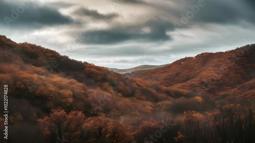 cloudy, autumn, afternoon, hill, orange, red, foliage, diffused, light, peaceful, reflective, atmosphere, beauty, nature