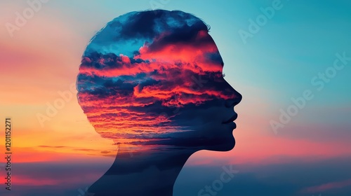 Cloudy watercolor idea. A silhouette of a person with vibrant clouds reflecting emotions and thoughts.