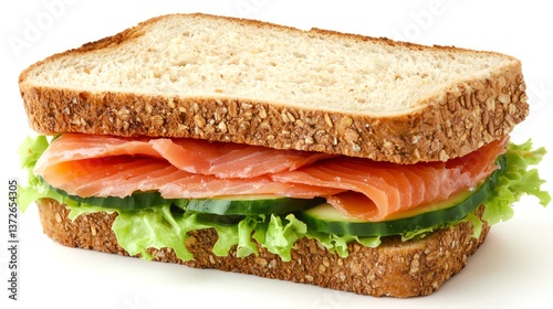 Club sandwich made with multigrain toast, filled with egg salad, lettuce and crispy bacon, macro close-up of stacked layers