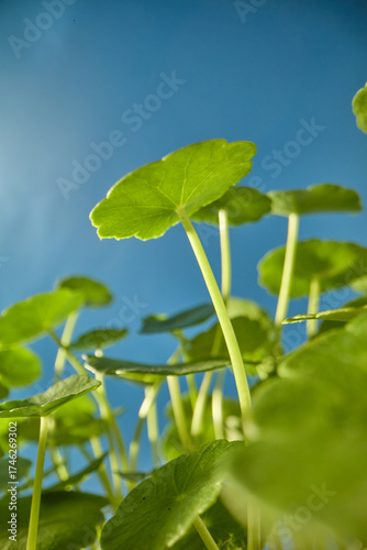 Cluster of Centella leaves photographed clearly from below, against bright sky, styled for skincare, vitality and natural ingredient use.