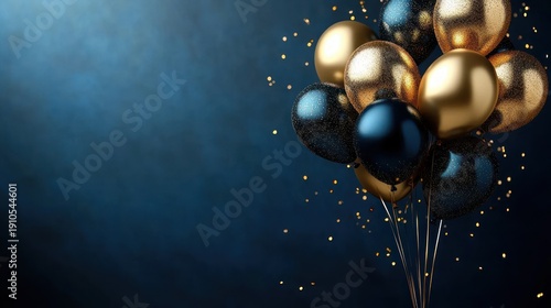 cluster of gold and dark blue glitter balloons with scattered confetti on moody blue background, elegant and celebratory atmosphere