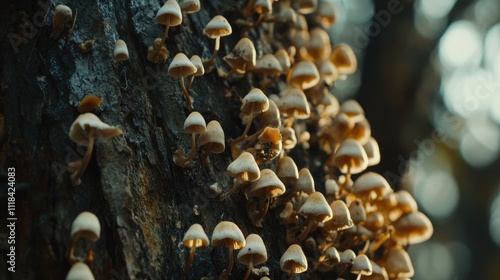 mushroom, fungal, fungal, tree, trunk, wood, forest, nature, flocked, group, growth, cap, stem, gill, spore, autumn, fall, light, sunlight, shadow, brown, beige, tan, cream, colours, texture, detail, macro, photo, closeup, outdoors, wild, natural, ecology, environment, botanical, mycology, scene, image, background