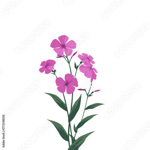 Cluster of pink phlox flowers with green leaves on white background — elegant botanical vector in soft minimal style