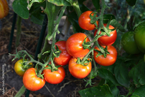 Cluster of Ripe Red Tomatoes on the Vine in an organic Garden