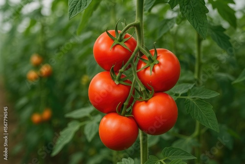 Cluster of vibrant red tomatoes maturing on the vine inside a greenhouse