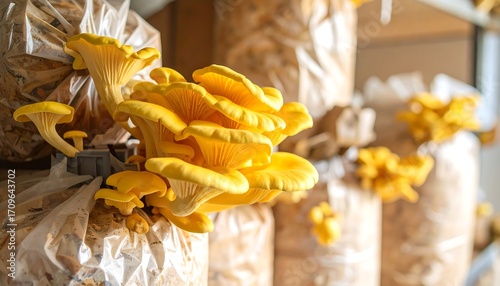 mushroom, yellow, cluster, bag, growing, farm, produce, fresh, organic, healthy, food, nature, cultivation, closeup, detail, bright, harvest, agriculture, stack