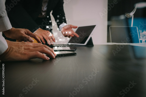 co working team meeting concept,businessman using smart phone and digital tablet and laptop computer in modern office with glass reflected view