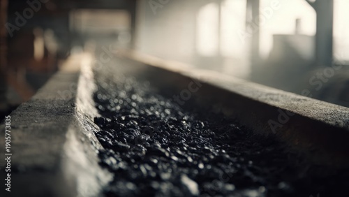 coal, conveyer belt, industrial, industry, mining, energy, fossil fuel, fuel, black, conveyer, transport, material, resource, production, power, rock, mine, factory, raw material, anthracite, lignite, crude oil, carbon, combustible, closeup, detailed, warm light, texture, indoor, daylight, machinery, equipment