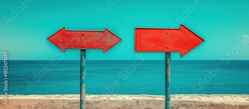 Coastal direction signs, ocean background, choice concept