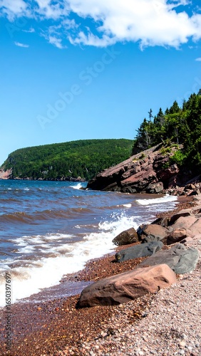 beach, coast, ocean, wave, rock, shore, water, landscape, scenic, nature, outdoors, summer, blue, sky, cloud, red, brown, green, forest, hill, travel, vacation, view, sea