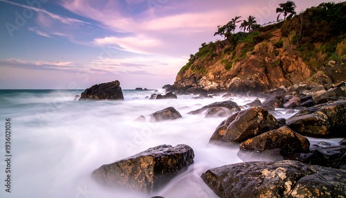 Coastal Serenity - Rocks, Waves, and a Tranquil Sunset.