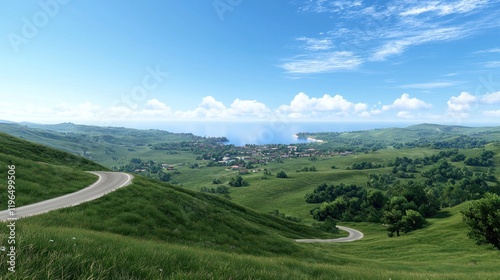 winding road, scenic view, seascape, landscape, summer, daytime, blue skies, white cloud, countryside, hill, meadow, road trip, travel, vacation, nature, outdoors, horizon, ocean, sea, coast, village, house, tree, green, blue, white, calm, serene, peaceful, tranquil, idylli, beautiful, picturesque, relaxing, bright, sunlit, sunny, clear, open, wide, expansive, vista, viewpoint, perspective, aerial
