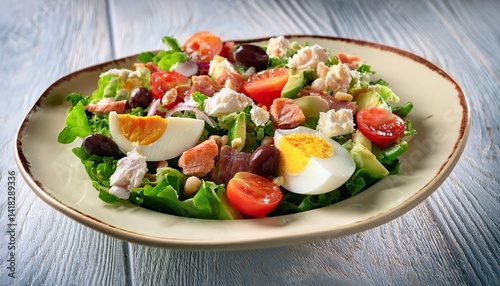 tomatoes, vegetable, avocado, meal, lunch, food, salad, lettuce, chicken, egg, green, american, meat, bacon, dinner, chopped, fresh, healthy, diet, cookery, epicure