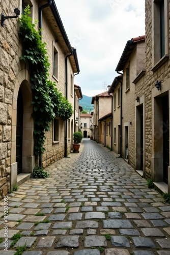 Cobblestone Lane A Picturesque View of Historic European-Style Architecture with Lush Greenery and Charming Stone Buildings