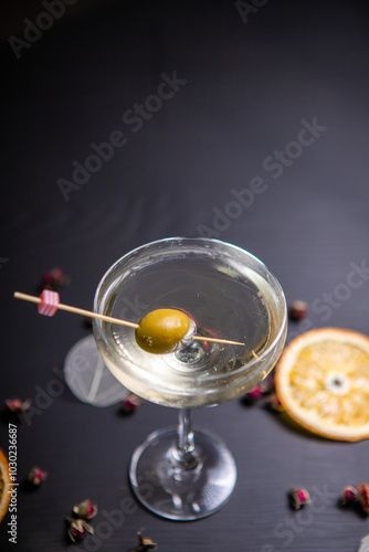 Cocktail based on martini in a glass on a thin stem, decorated with an olive