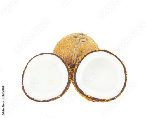 Coconut and coconut flesh over white background