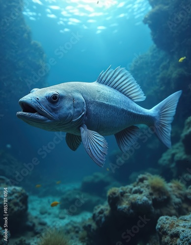 fish, animal, marine life, ocean, sea, wildlife, aquatic, underwater, nature, deep sea, rare, conservation, biology, zoology, science, education, discovery, ancient, creature, perch, grouper, bass, predator, swimming, fin, gill, scale, blue, grey, rock, reef, coral, oceanography, fishing, diving, exploration, aquarium, museum, illustration, poster, article, background, concept