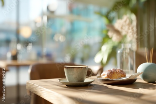 lifestyle, morning, cafes, business, relaxation, hot drink, croissant, food, beverage, break, leisure, indulgence, well-being, hospitality, workplace, entrepreneurship, comfort, simplicity, pleasure, happiness, enjoyment, recharge, calm, cosy, aroma, favor, freshness, epicure, bakery, pastry, breakfast, sunlight, ai, generated, technology, digital, innovation, modern, trend, aesthetic, ceramic, wood, table, plate, vase, plant, flower