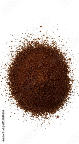 Coffee beans, scattered, curved arrangement, Coffee grounds explosion, dark brown particles, dynamic splatter isolated on white background.