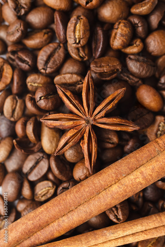 Coffee beans with spices anise and cinnamon. Top view. Closeup