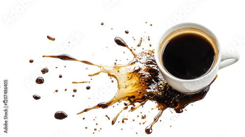 Coffee cup on white background with splashes of liquid, capturing the dynamic motion of a spilled drink.