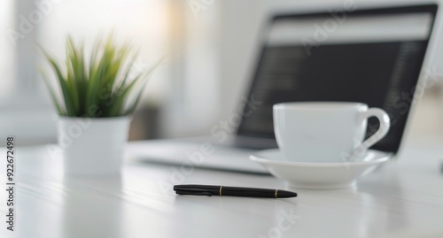 hot drink, laptop, desk, workspace, plant, saucer, black, productivity, modern, office, decor, potted, writing, pen, minimalism, home, serene, beverage, technology, equipment, clean, cosy, comfort, organisation, essential, sharpened, tea, cup, relaxation, morning, ritual, workday, remote, work, setup, professional, stylish, inviting, environment, inspiration, supply, studying, freelance