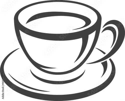 Coffee cup vector illustration in bold outline, black and white minimalistic line art of steaming hot cup on saucer, simple and elegant design for cafe logos, menu icons, print, and digital use