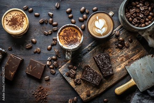 coffee cups prepared in different shapes, placed on a very dark rustic wooden background.
