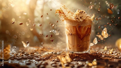 hot drink, iced, whipped, cream, glasses, bean, butterfly, splash, drink, brown, sweet, delicious, tasty, background, gold, light, summer, sun, warm, blurry, bokeh, fresh, caffeine, energy, morning, afternoon, dessert, epicure, aroma, whimsical, dreamy, fantasy, joyful, beautiful