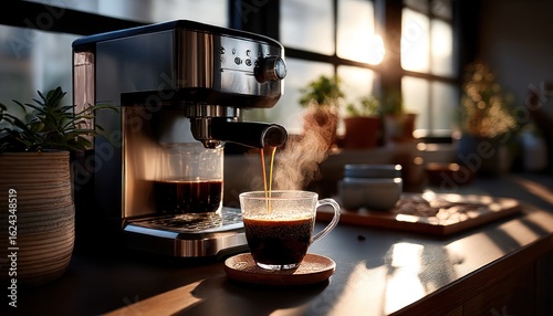 hot drink, machine, espresso, brew, steam, cup, warm, sunlight, window, plant, kitchen, morning, home, drink, dark, brown, glasses, light, modern, still