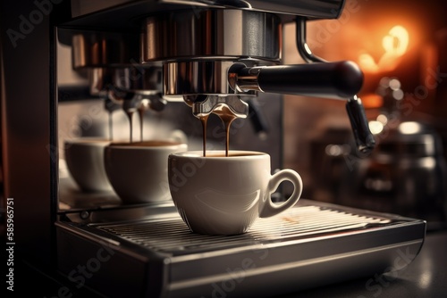 Coffee maker with cup of cappuccino, coffee machine, close-up view of coffee cup, Generative AI