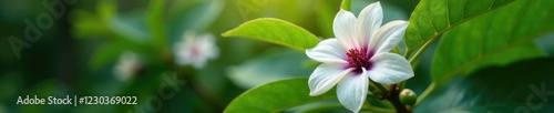 Coffee plant with large white and purple flowers blooming in the shade, plant growth, coffee