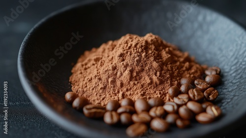 Coffee Powder with Coffee Beans on Textured Black Plate Background