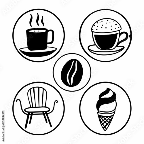 hot drink, cup, bean, chair, ice, cream, cafes, drink, food, table, eatery, breakfast, espresso, latte, cappuccino, dessert, aroma, caffeine, design, element, graphic, line, outline, simple, symbol, drawing, vignetting, vintage, retro, style, art, hand, drawn, black, set, collection, menu, shop, signs, logotype