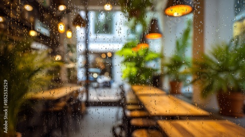 cafes, window, raindrop, interior, view, wet, rainy, drop, water, liquid, blurred, blurry, photo, background, glasses, pane, light, bokeh, cosy, comfort, relaxation, leisure, peaceful, calm, mood, autumn, winter, season, cold, warm, window sill, table, chair, furniture, empty, cafes, eatery, bar, indoor, urban, city, street, outside, atmosphere, weather