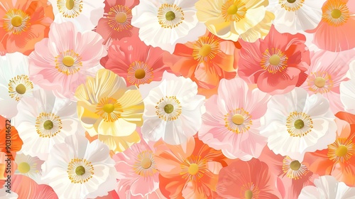 seamless pattern, vibrant, floral, pink, white, coral, orange, yellow, highlight, design, pleasing, eye-catching, balance, floral pattern, fabric design, digital print, graphic design, textile design