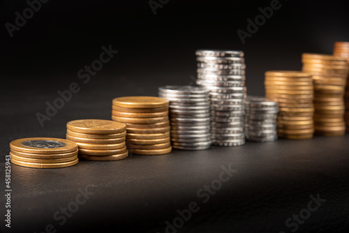 Coins, Brazilian coins of various values ​​stacked on black leather, selective focus.