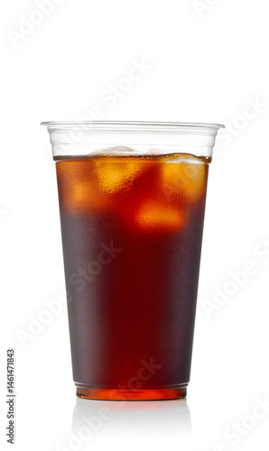 Cola cold drink with ice cubes, in plastic cup, isolated on a white studio background