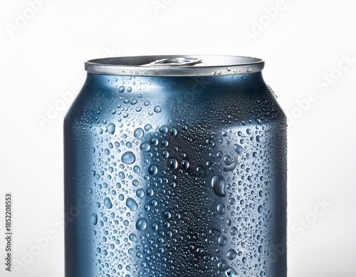 cold aluminum beverage can with water droplets isolated on white background