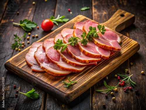 Cold Boiled Pork Slices on Wooden Board - Top View Food Photography