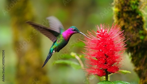 Colibri Thalassinus in Paradise: A Hummingbird's Dance Among Red Flowers and Tropical Greenery