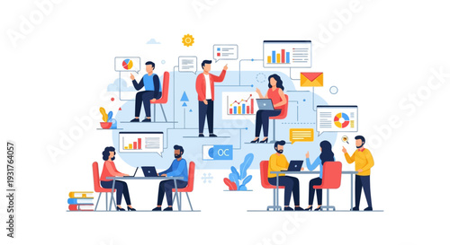 Collaborative Business Workflow Network Illustration. Team Analyzing Data, Strategy, and Project Management Concept.