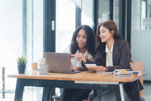 businesswoman, teamwork, collaboration, success, office, modern, laptop, datum, analysis, technology, partnership, colleague, professional, female, woman, diversity, discussion, planning, strategy, meeting, workplace, cooperation, productivity, efficiency, innovation, growth, development, business, career, ambition, achievement, goal, result, sharpened, concentration, confident, determined, support, friendship, communication, interaction, connection, stylish, elegant, contemporary