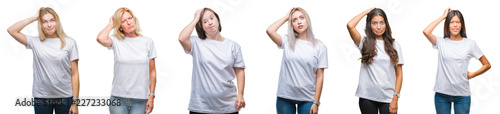 Collage of group of women wearing white t-shirt over isolated background confuse and wonder about question. Uncertain with doubt, thinking with hand on head. Pensive concept.