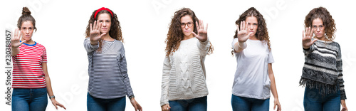 Collage of young brunette curly hair girl over isolated background doing stop sing with palm of the hand. Warning expression with negative and serious gesture on the face.