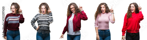 Collage of young brunette curly hair girl over isolated background pointing finger up with successful idea. Exited and happy. Number one.