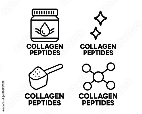 Collagen Peptides Icon Set with Jar, Stars, Scoop, and Molecule Symbols