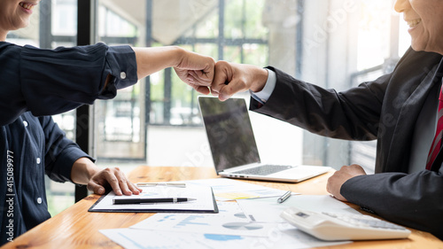 Colleagues Achievement Business Casual Fist bump together after dealing mission business, Business success and teamwork concept