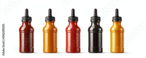 Collection of assorted squeeze bottles filled with various sauces on a white isolated background.