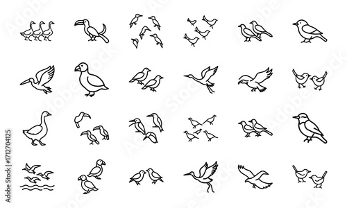 Collection of Bird Silhouettes in Line Art Style – Flying Birds, Pairs of Birds, Flocks, and Individual Bird Icons on White Background